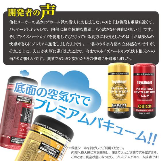 トイズハートの「プレミアムトイズハートカップ クイック」は、ロングセラー商品「クイックカップ」をさらに進化させた、ワンランク上のカップホール。最大の特長は入り口部分の肉厚設計とプレミアムな刺激感。入口がしっかりと厚みを持つことで、しっかりと包み込まれる柔らかな感触が楽しめる仕様となっている。さらに、カップならではの手軽さと衛生的な使い切りタイプをキープしつつ、従来のカップ製品とは一線を画す「上質な密着感」と「心地よい爽快感」が得られる大人のプレミアム仕様となっている。これまでのカップ型製品に満足できなかった人にもオススメで、「より高度な刺激」「しっかりとした使い心地」を楽しめる。