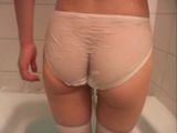 純白の下着姿の女の子がお風呂に入るのだが、下着は脱がずにそのまま湯船に浸かってしまう。すると、白い下着がどんどん透けてきて、お尻の割れ目が丸見え状態に! 股間の黒ずんだ部分まで透けて見えるような気がするのだから素晴らしい。