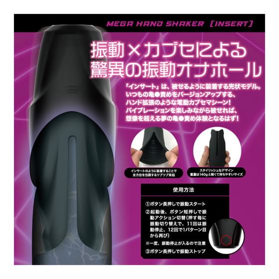 T-BESTの「メガハンドシェイカー インサート」は、“振動×カブセ”による新感覚の電動被せ型オナホール。強力バイブレーション搭載で、通常の手コキでは味わえない激烈な快感を実現。全10パターンの振動モードを備え、USB充電式で約90分の充電で約60分連続稼働が可能。内部には兜状のツブツブ突起を多数配置し、ペニス全体を包み込むような“覆い責め”構造が特徴。柔らかな高級シリコン素材を使用し、滑らかな肌触りと手軽なメンテナンス性を両立している。
