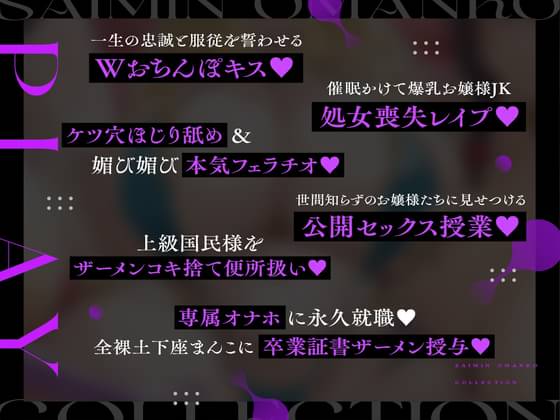 失楽少女の催○おまんこコレクションシリーズ「✅10/16まで早期限定特典✅【密着淫語囁き】催○おまんこコレクション ~絶対服従お嬢様JKオナホハーレム~【KU100】」は、お嬢様JKを専用オナホにして絶対服従させるハーレム音声作品。理事長と校長に催○をかけて全校集会を開き…そこで教職員と生徒全員に一斉催○…♪