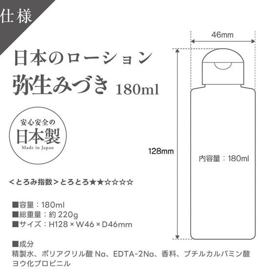 ワイルドワンの「日本のローション 弥生みづき 180ml」は、清純派でありながら圧倒的なエロスで人気を誇るAV女優・弥生みづきのリアルな愛液感を追求した高品質ローション。無色・無着色タイプでシーツや服にも残りにくく、安心して使える日本製・ノンシリコン水溶性ローション。弥生みづき本人の愛液質感を収録現場で徹底観察し、リアルな粘度・糸引き・質感・香りを忠実に再現。猛烈なピストンプレイでも乾きにくいので、激しい動きでも潤いが長続き。洗い不要のテクスチャで、いやらしい糸引きがありつつもティッシュ1枚で簡単に拭き取ることができる。